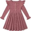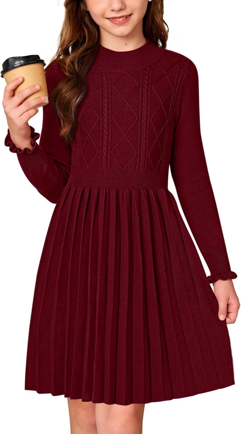 - Girls Cable Knit Dress – This cable knit dress combines fashion and warmth, featuring a long sleeve top and a matching midi skirt. The elastic waist ensures comfort, while the cable knit texture adds a stylish touch, making it suitable for fall and winter